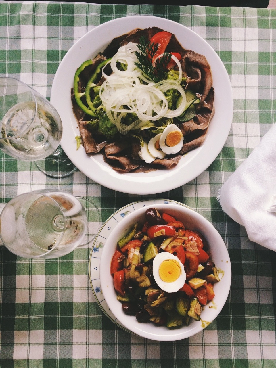Wir marschieren los Richtung Gerngroß und stellen erst dort vor Ort fest, dass der gar nicht auf hat. Oh-oh! Also müssen wir den ganzen Weg zurück und dann noch weiter – neues Ziel ist Marianne mit ihren Backhendln. Die hat aber überhaupt Urlaub. Oh-oh! Wir gehen noch ein Stück weiter zum Felberjörgl – und haben Glück. Im schönen Gastgarten genießen wir eine Flasche Wein und essen Winzer- und Rindfleisch-Salat. Leute, i sag’s euch ehrlich, s’Leben is herrlich!